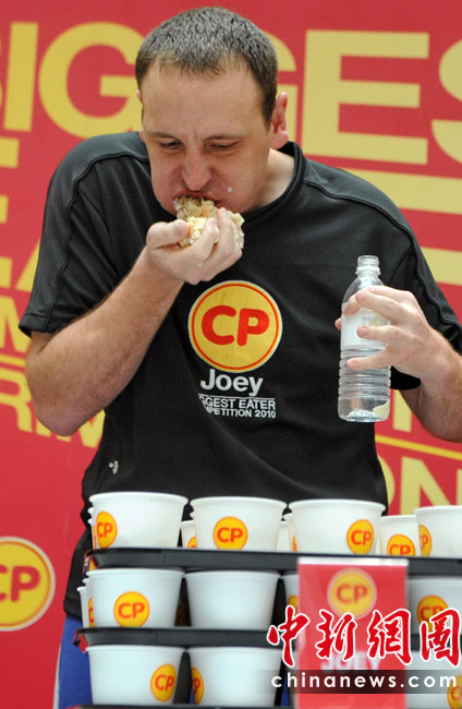 5月9日,新加坡举行了一场别开生面的世界吃馄饨大赛,来自全球各地的多名大胃王在比赛中一较高下。最终在8分钟内狂吞380个的美国选手获得了冠军。图为最终获得冠军的美国选手。