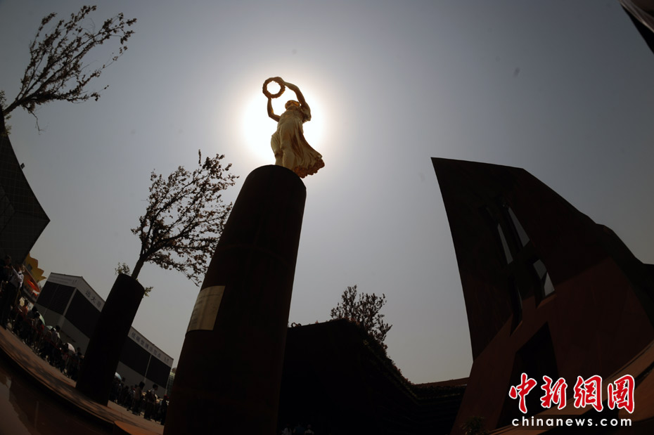 图为卢森堡馆外的“金色少女”。中新社记者 廖攀 摄