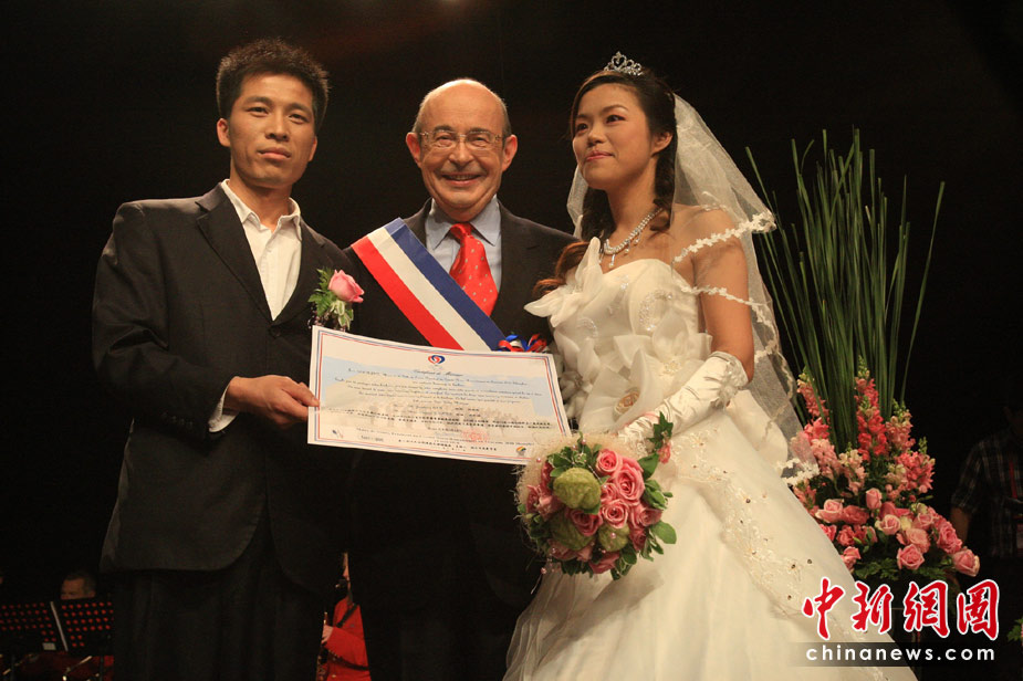5月11日,35对新人来到世博法国馆内举行婚礼仪式。法国馆举行“法兰西浪漫婚典”的集体婚礼。图为法国图尔市长为参与此婚典的新人颁发“证书”。中新社发 潘索菲 摄