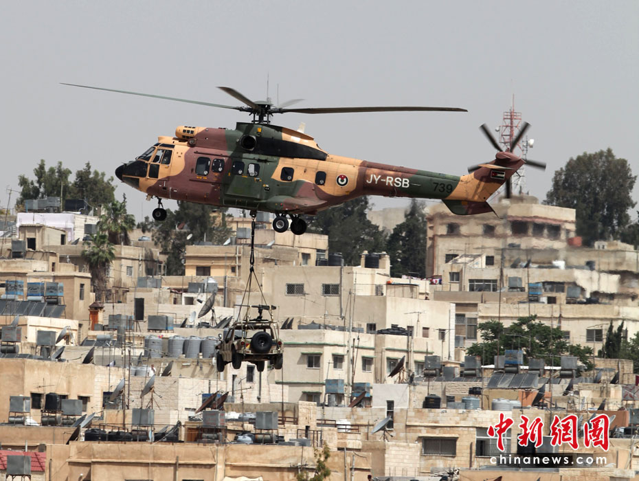 5月11日,约旦特种部队在安曼空军基地附近举行演习,为特种作战部队展览会(SOFEX)开幕式助兴。该展览会为期4天,展览主题包括国家安全及反恐措施。图片来源:中国新闻网