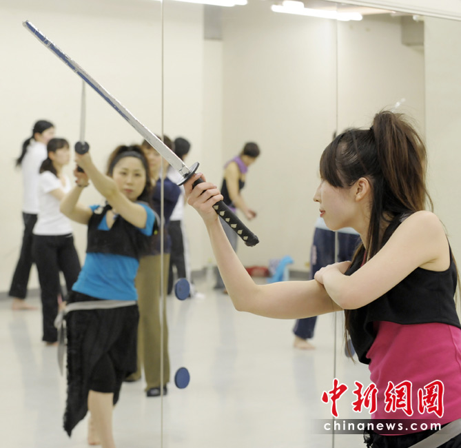 近日,在日本东京,众多白领女性学起了日本传统的武士刀,用来减压。