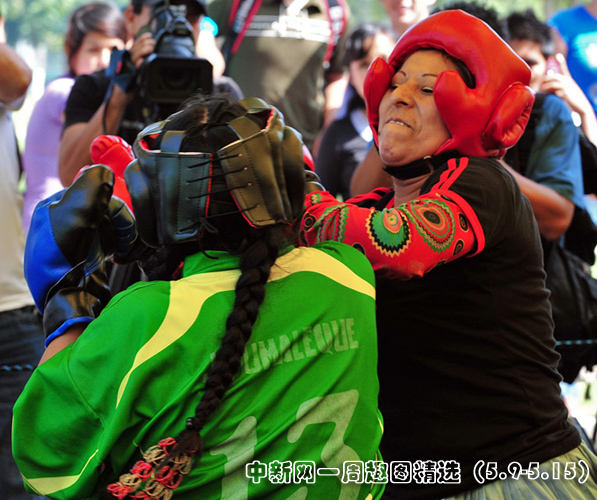 5月13日,秘鲁利马高地举办的传统食品博览会上,两名安第斯农民妇女穿着象征秘鲁和玻利维亚的裙子同台搏击妙趣横生。图片来源:中国新闻网>>点击观看详细内容