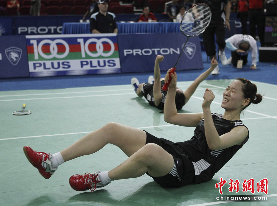 5月15日,在马来西亚吉隆坡举行的2010年尤伯杯女子羽毛球团体赛决赛中,中国队(黄衣)以1比3负于韩国队,获得亚军。图片为韩国队在欢庆胜利。图片来源:中国新闻网