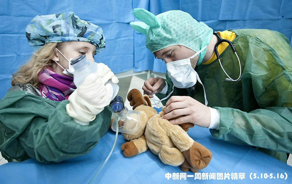周一(10日),在德国柏林的菲尔绍临床中心的“泰迪熊医院”,莱奥尼(Leonie, 左)和一名医科学生在为一个毛茸玩具动手术。这家医院旨在减轻孩子们对医生和医疗设备的恐惧感。