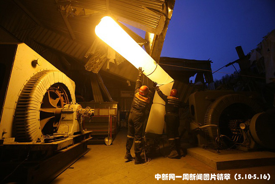 周一(10日),在俄罗斯的梅日杜列琴斯克地区,工作人员在被煤矿爆炸损毁的大楼内安装照明设施。上周发生的矿难导致至少32人遇难,58人被困于地下。