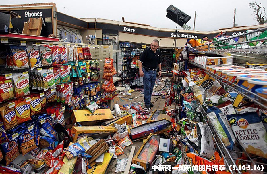 周二(11日),在美国俄克拉荷马市东部的一处卡车休息站,沃伦·华尔滋(Warren Waltz)查看受灾情况。龙卷风周一袭击了美国南部平原,当时汽车被吹离高速公路,房屋被掀翻,目前已有至少五人遇难。