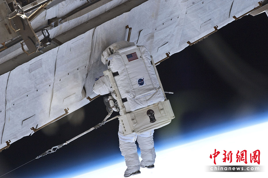美国当地时间5月17日,“亚特兰蒂斯”号航天飞机宇航员加雷特·赖斯曼和史蒂夫·鲍恩进行了与国际空间站对接后的首次太空行走。图片来源:中国新闻网
