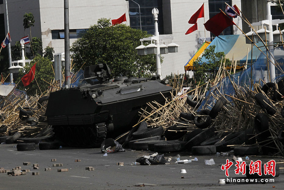 19日泰国军方对聚集在首都曼谷市示威的反政府“红衫军”展开了驱散行动。军方装甲车已突破“红衫军”所筑路障,且至少有3人被枪击中。图片来源:中国新闻网