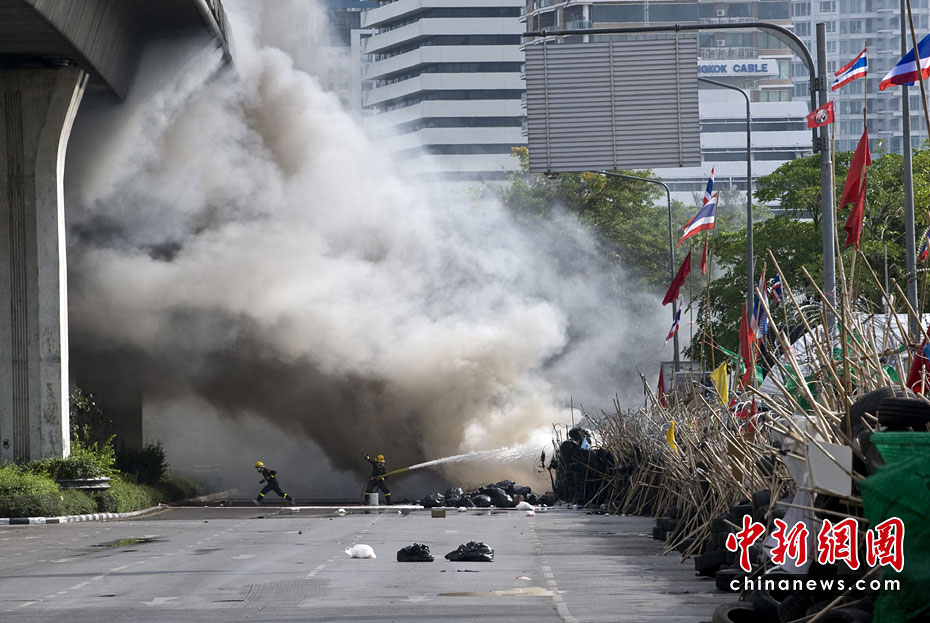 19日泰国军方对聚集在首都曼谷市示威的反政府“红衫军”展开了驱散行动。军方装甲车已突破“红衫军”所筑路障,且至少有3人被枪击中。图片来源:中国新闻网