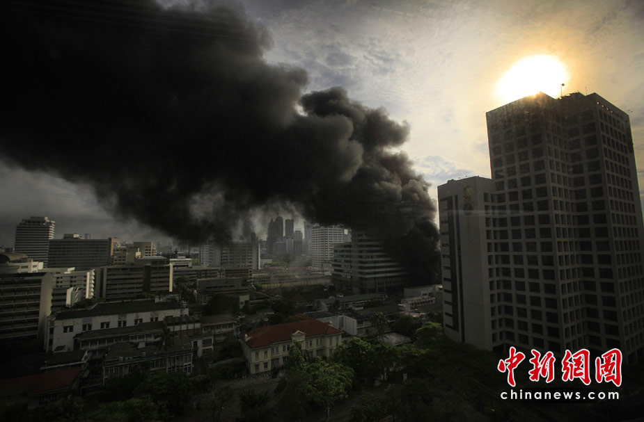 19日,发起驱散行动的泰国军方突破了反政府“红衫军”示威者在曼谷市中心所筑路障,进入其营地内,双方爆发枪战。目击者称,已有至少9人受伤,多数是被枪击中。 图为“红衫军”成员在曼谷一所医院附近集会并燃烧轮胎。