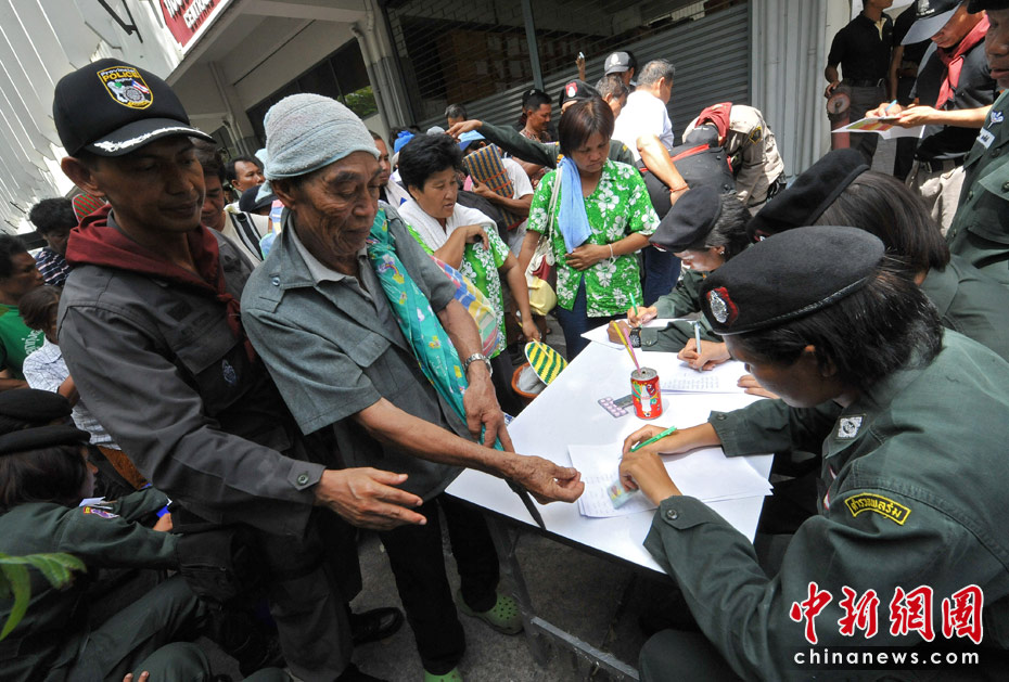 5月20日,数千名结束集会的外地“红衫军”示威者在曼谷拉差巴颂地区接受登记和安全检查后,乘坐政府安排的车辆返回家乡。