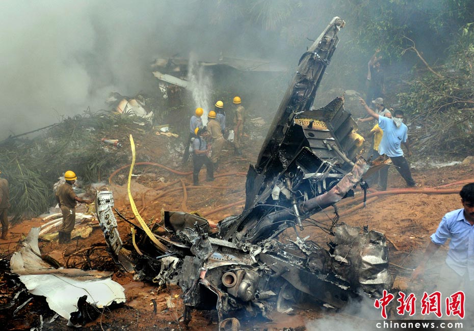 5月22日,印度一架客机在南部卡纳塔克邦门格洛尔市降落时失事,造成至少160人丧生。目击者称,当天早上6点左右,这架飞机准备在马拉格尔机场降落,但不知何故冲出跑道然后一头扎到机场附近的丛林中起火爆炸。图片来源:中国新闻网