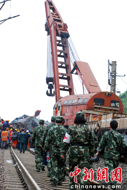 5月23日凌晨2时10分,沪昆铁路江西东乡段发生一起客运列车脱线事故,截至上午9时,已有10人遇难,车内乘客全部被转移,现场救援工作正在紧张进行。事故发生后,南京军区武警,江西省消防、交警,中铁电气化局、医疗等部门立即组织近万名人员参与抢险救灾,目前现场已有10余台挖土机和吊车参与救援。中新社发 刘占昆 摄