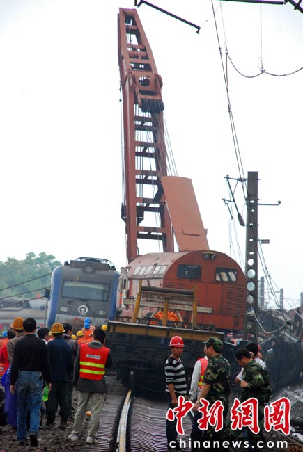 中新网东乡5月23日电(艾永全 何柳斌 刘占昆)23日下午14时,距离沪昆铁路客运列车脱线事发已经12小时,武警、消防、医护、交警、特警仍在事故现场紧急救援。 刘占昆 摄