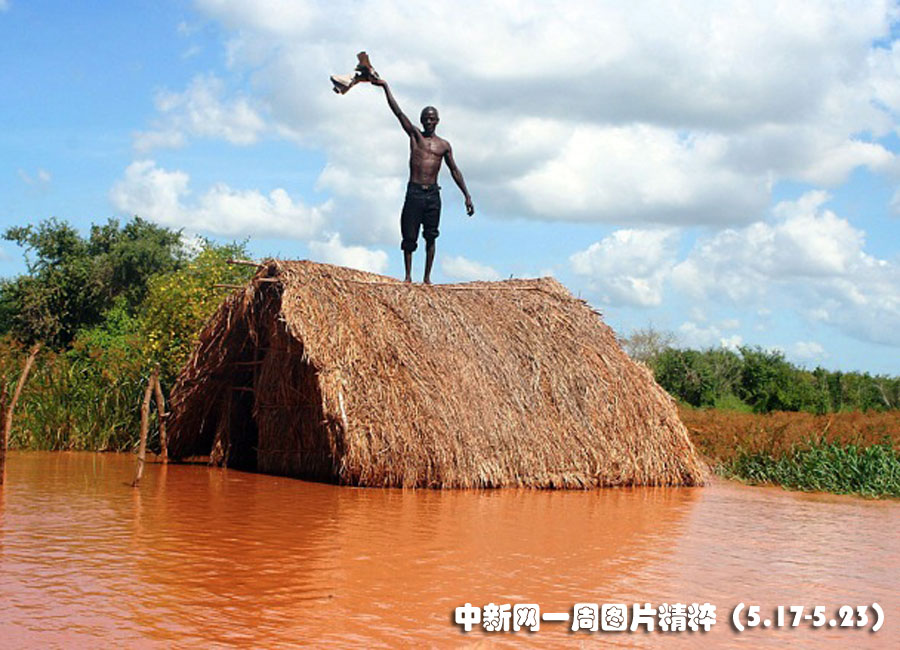 5月20日肯尼亚一名村民的茅草房被水淹没,他站在房顶寻求帮助。一个电厂开闸放水导致塔纳河决堤,造成100多人无家可归。