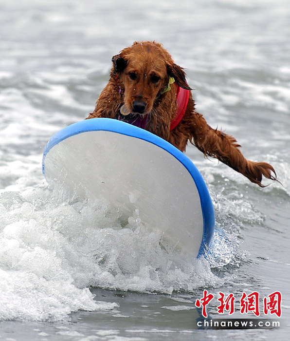 5月22日,美国加利福尼亚州圣迭戈举行了一场妙趣横生的狗狗冲浪比赛。图片来源:中国新闻网
