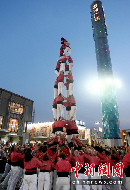 5月25日,西班牙“人塔”在上海世博会欧洲广场上逐层垒起,为西班牙加泰罗尼亚周助兴。“叠人塔”(HUMAN WALL),是西班牙加泰罗尼亚地区最具传统特色的民俗节庆活动,起源于18世纪末加泰罗尼亚南部的巴尔斯。后来,“叠人塔”活动逐渐在加泰罗尼亚其他地区流行,进而风靡整个西班牙。中新社发 杜洋 摄