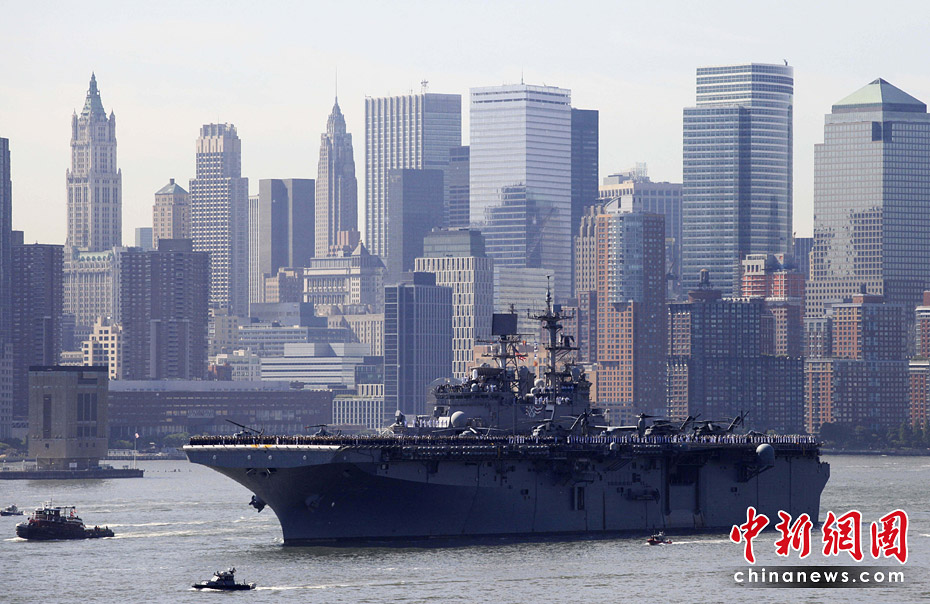 当地时间5月26日,美国第23届纽约舰队周开幕,包括“硫磺岛”号两栖攻击舰在内的11艘参加舰队周活动的军舰由南向北在哈得孙河面上游弋。纽约民众将以停靠在曼哈顿哈得孙河86号码头的“无畏号”航母博物馆为中心,展开为期一周的庆祝和纪念活动。图片来源:中国新闻网