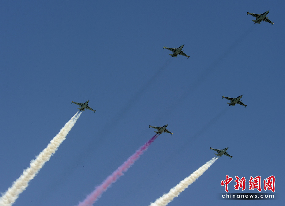5月26日,在格鲁吉亚首都第比利斯,受阅部队从议会大厦前走过。当日,格鲁吉亚在第比利斯举行庆祝格独立日阅兵典礼,格总统萨卡什维利在议会大厦前检阅军队并发表演讲。图片来源:中国新闻网