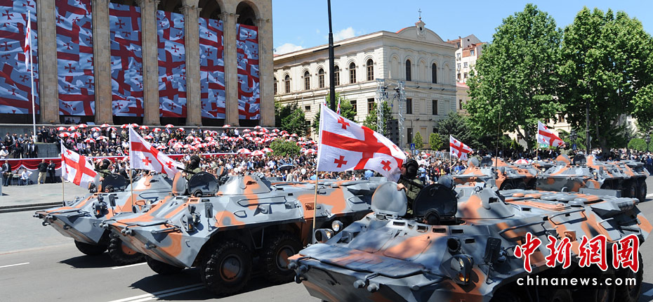 5月26日,在格鲁吉亚首都第比利斯,受阅部队从议会大厦前走过。当日,格鲁吉亚在第比利斯举行庆祝格独立日阅兵典礼,格总统萨卡什维利在议会大厦前检阅军队并发表演讲。图片来源:中国新闻网