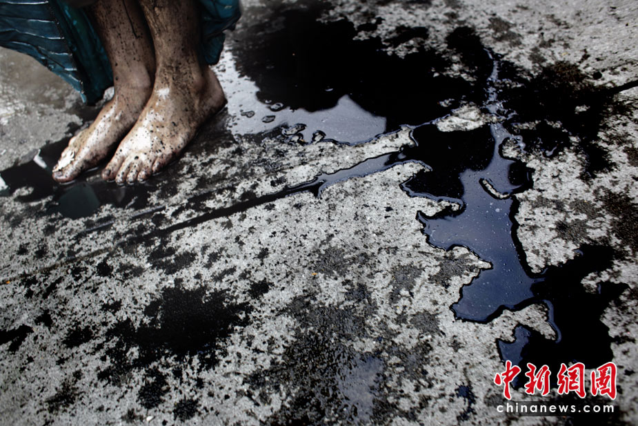5月28日,美国环保主义者在纽约曼哈顿的一家加油站前,身上涂洒黑色颜料,以此抗议墨西哥湾原油不断泄露。