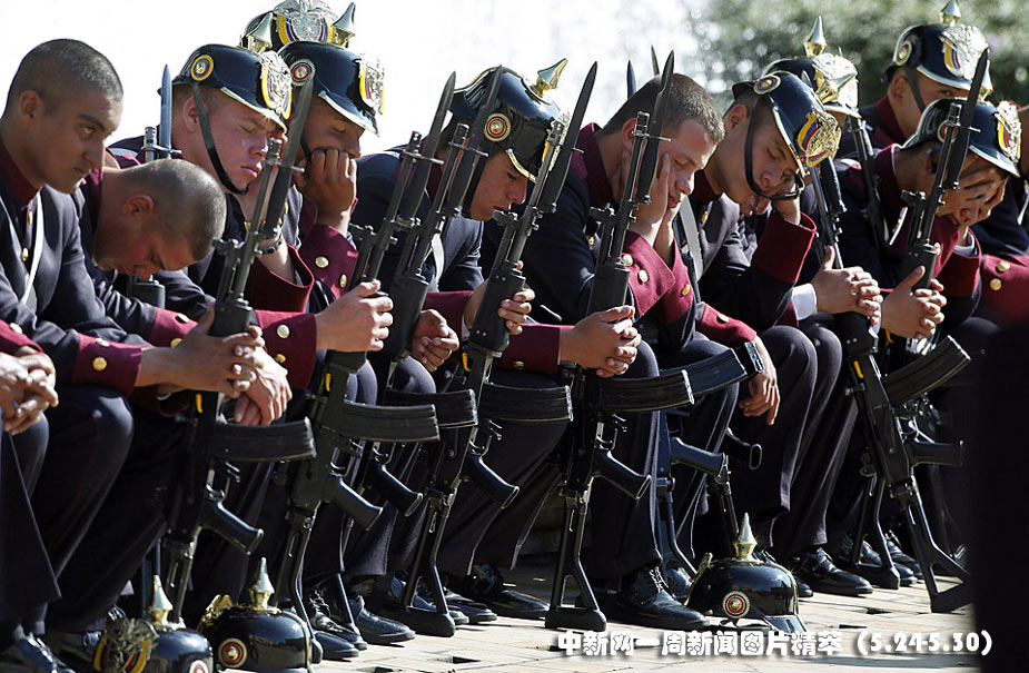 24日(周一),哥伦比亚波哥大,洪都拉斯总统访问哥伦比亚,士兵们在欢迎仪式前休息。