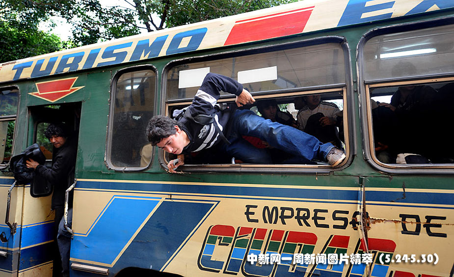 27日(周四),在巴拉圭首都亚松森,示威者向公交车投掷石头,乘客们纷纷跳出公交车。部分公交车司机举行罢工,要求加薪。