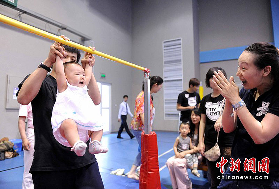 5月29日上午,北京,300多个六岁以下的宝宝在乐成国际学校参加六一欢动会活动。图为宝宝在老师的辅助下完成超级单杠。欧阳晓菲/CFP