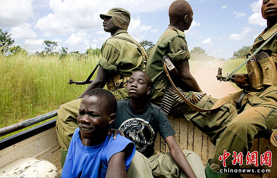 学校放假了,Ronald(左)和Ongom(右)乘卡车回到乌干达帕德尔境内流民营。Ronald(左)和Ongom(右)以前都是儿童军。在穿越叛军活动频繁的地区时,有士兵保护他们的安全。图片来源:CFP