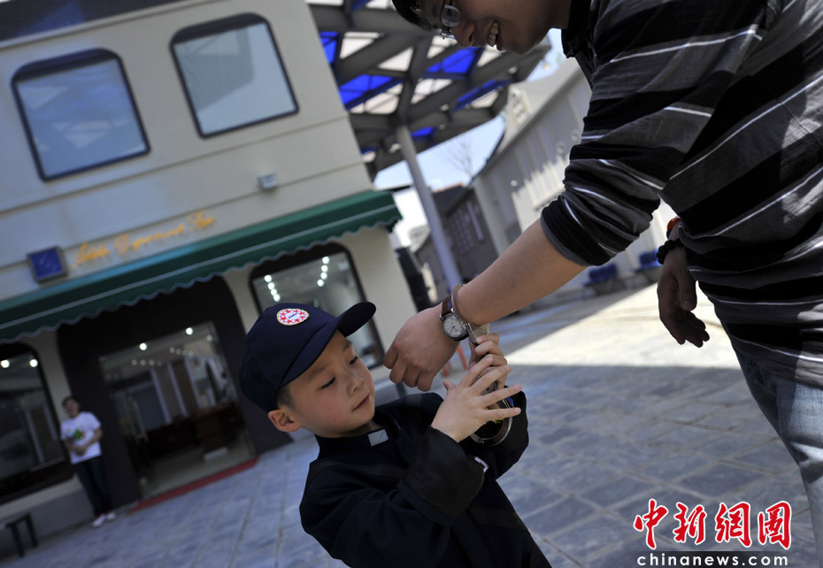 图为“小警察”在逮捕“罪犯”。 中新网记者 王红纲 摄