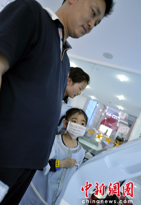 图为孩子在体验做一名护士,为家人体检。 中新网记者 王红纲 摄