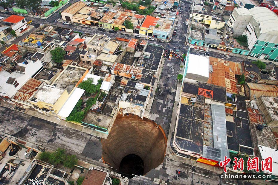5月31日,受飓风“阿加莎”的影响,危地马拉首都危地马拉城出现一个深达60米塌陷洞,有目击称一幢3层建筑坠入洞中,至少造成1人死亡。图片来源:中国新闻网