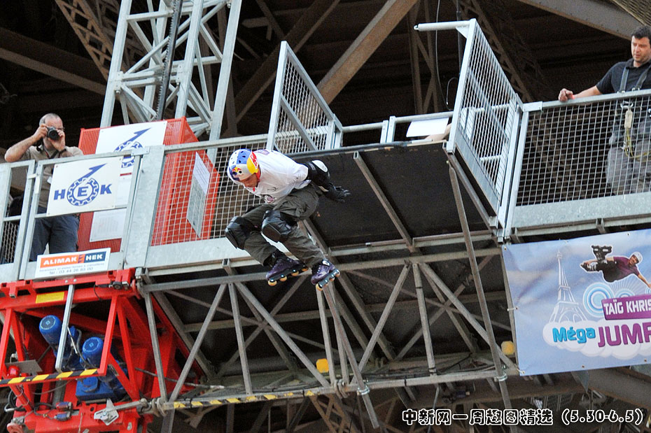 5月29日,法国巴黎,法国极限直排轮冠军克里斯(Taig Khris)从法国艾菲尔铁塔跳下,创下世界新自由落体纪录。图片来源:中国新闻网>>点击观看详细内容