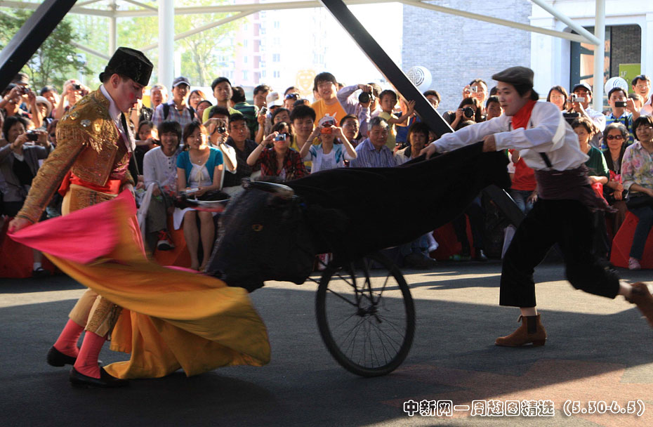 新近,上海世博园区里的各种趣味演出连连,西班牙斗牛士与一头假公牛相互角逐,让众多游客乐开怀。图片来源:中国新闻网>>点击观看详细内容