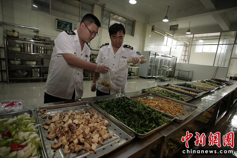 2010年6月4日,山东省潍坊市卫生系统的工作人员检查潍坊城区的高考考点食堂,为高考“保驾护航”。对此,高新区卫生局购置了针对农残、亚硝酸盐、重金属等快速检测的食品安全快速检测设备,确保考生饮食安全。孙树宝/CFP
