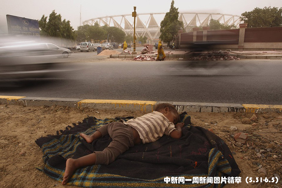 周四(3日),印度新德里,英联邦运动会即将开幕。图为一个孩子路边熟睡。