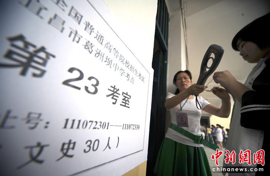 2010年全国高考6月7日日拉开大幕,957万考生走进考场。由于报名人数减少,而招生计划增加,教育部预计今年全国高考平均录取率将会增加近7%。6月6日下午,参加2010年高考的湖北宜昌考生走进葛洲坝中学考点熟悉考场,进场前,监考老师手持金属探测仪器对考生一一进行认真的安全检查。刘曙松/CFP