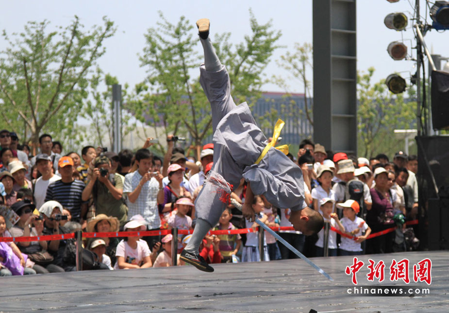 自5月1日开始,上海世博园D片区综艺广场每天都有少林寺功夫展演,受到世博参观者的热捧。中新社记者 殷春永摄