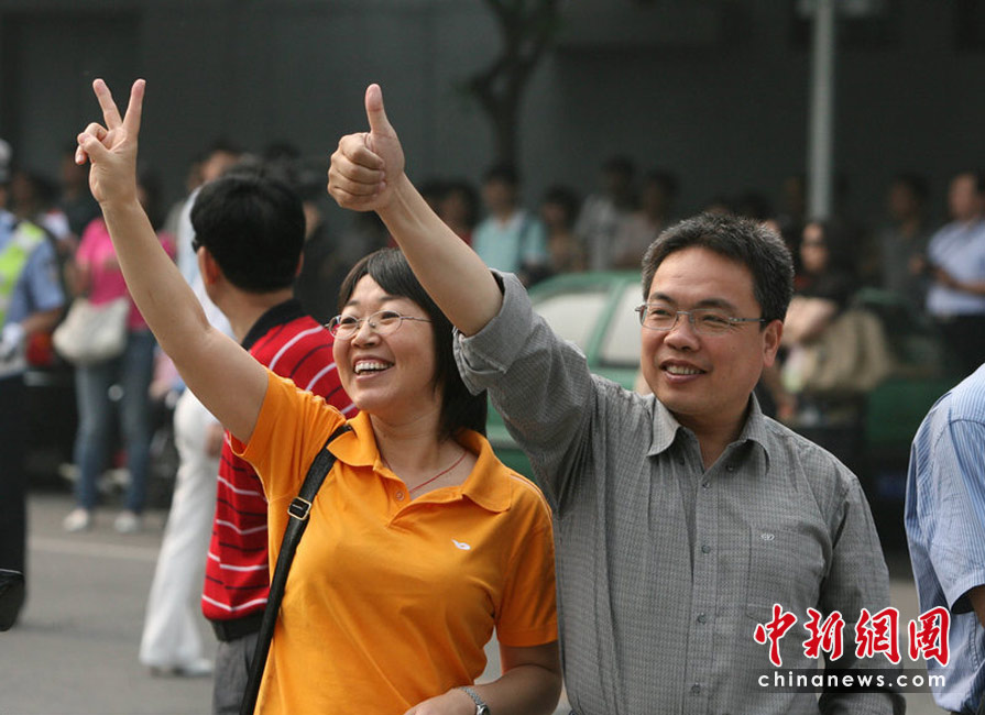 6月7日,为期两天的2010年普通高等学校招生全国统一考试开考,全国将有957万考生走进考场。图为两位家长在目送孩子进入考场后,不忘做出鼓励的手势。杨登峰摄