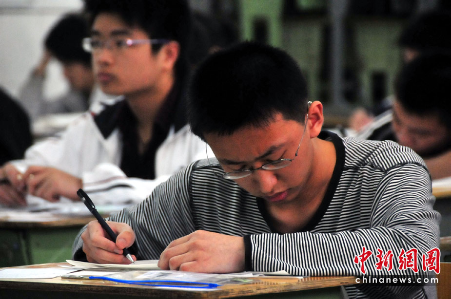 6月7日,为期两天的2010年普通高等学校招生全国统一考试开考,全国将有957万考生走进考场。图为考生在答题。中新社发 李向雨 摄