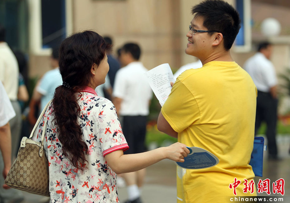 6月7日,为期两天的2010年普通高等学校招生全国统一考试开考,全国将有957万考生走进考场。图为母亲为儿子扇风降温。中新社发 苏丹 摄
