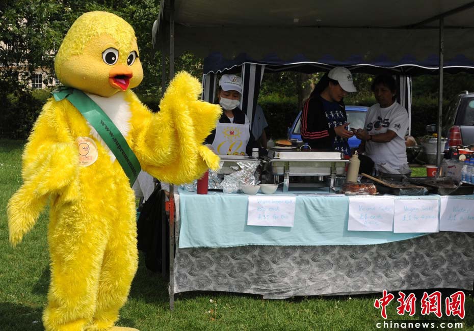 当地时间2010年6月6日,英国伦敦举行卡姆登绿色市集(Camden Green Fair),这是英国伦敦每年环保领域的“重头戏”。本届市集的主旨是要唤起大众对环境问题的关注,选择更加可持续发展的生活方式。据活动主办方预计,本届市集将吸引来自英国各地和世界各国的2万多人参加。图为打扮成小鸡的素食主义者宣传素食。Fiona/摄 Fiona 马小刚/文