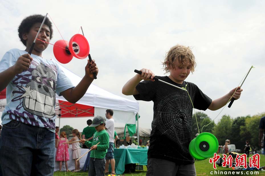当地时间2010年6月6日,英国伦敦举行卡姆登绿色市集(Camden Green Fair),这是英国伦敦每年环保领域的“重头戏”。本届市集的主旨是要唤起大众对环境问题的关注,选择更加可持续发展的生活方式。据活动主办方预计,本届市集将吸引来自英国各地和世界各国的2万多人参加。图为抖空竹是个时髦运动。Fiona/摄 Fiona 马小刚/文