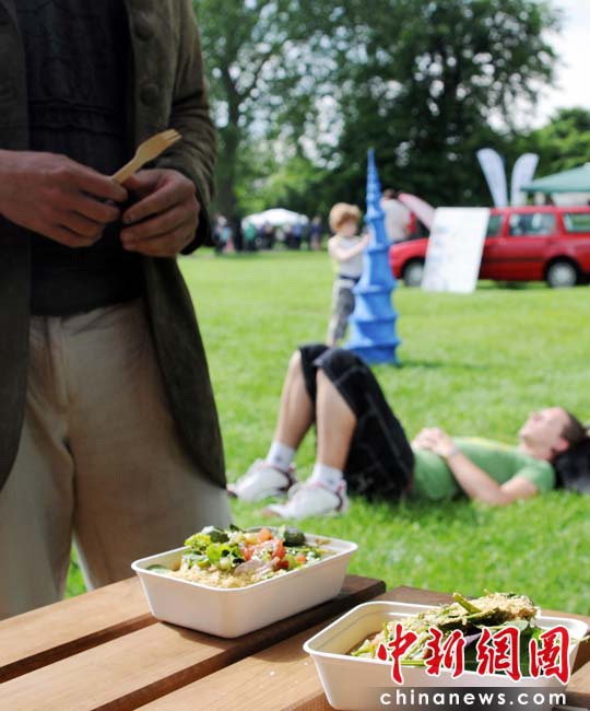 当地时间2010年6月6日,英国伦敦举行卡姆登绿色市集(Camden Green Fair),这是英国伦敦每年环保领域的“重头戏”。本届市集的主旨是要唤起大众对环境问题的关注,选择更加可持续发展的生活方式。据活动主办方预计,本届市集将吸引来自英国各地和世界各国的2万多人参加。图为各种素食是绿色展会的绝对“主力”。Fiona/摄 Fiona 马小刚/文