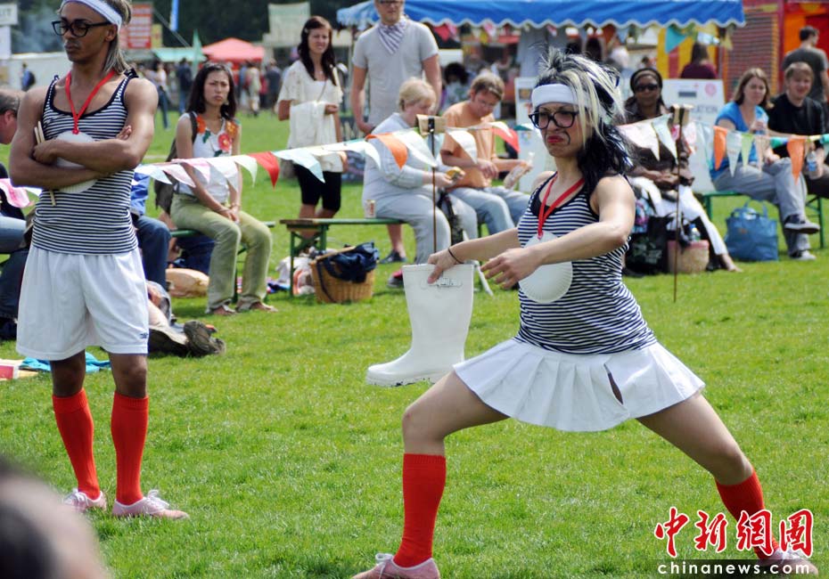 当地时间2010年6月6日,英国伦敦举行卡姆登绿色市集(Camden Green Fair),这是英国伦敦每年环保领域的“重头戏”。本届市集的主旨是要唤起大众对环境问题的关注,选择更加可持续发展的生活方式。据活动主办方预计,本届市集将吸引来自英国各地和世界各国的2万多人参加。图为活动志愿者组织大家玩儿传统的夏季游戏“扔靴赛”。Fiona/摄 Fiona 马小刚/文