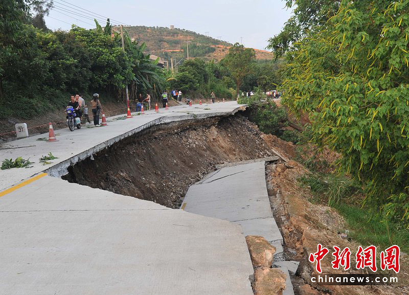 6月8日下午4点半,福建闽侯白沙镇115县道31公里处路面发生塌陷,路面整体下陷20多米,路基裂痕长达百米,所幸无人伤亡。图片来源:CFP