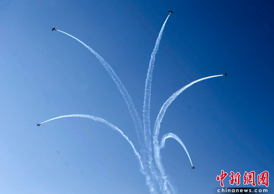 当地时间6月9日,南非约翰内斯堡足球城,飞行表演队在进行演练。中新社发 廖攀 摄