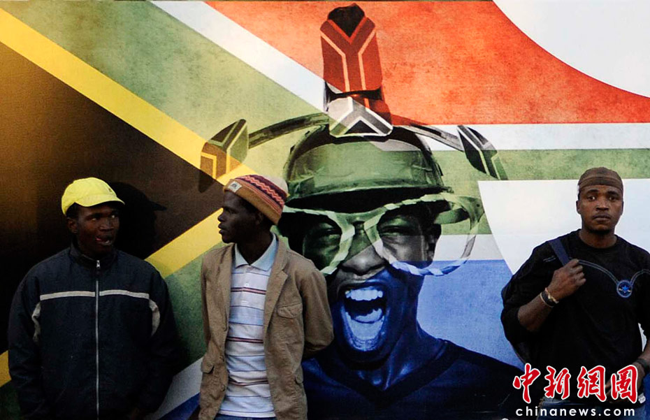 当地时间6月9日,民众在南非约翰内斯堡街头的世界杯宣传画前,非洲大陆即将首次迎来足球世界杯。中新社发 廖攀 摄