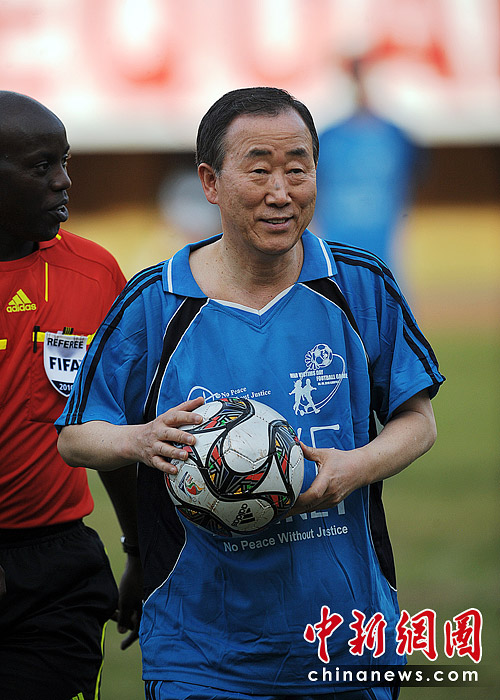 图为2010年5月30日,联合国秘书长潘基文在曼德拉国家体育场参加足球赛。
