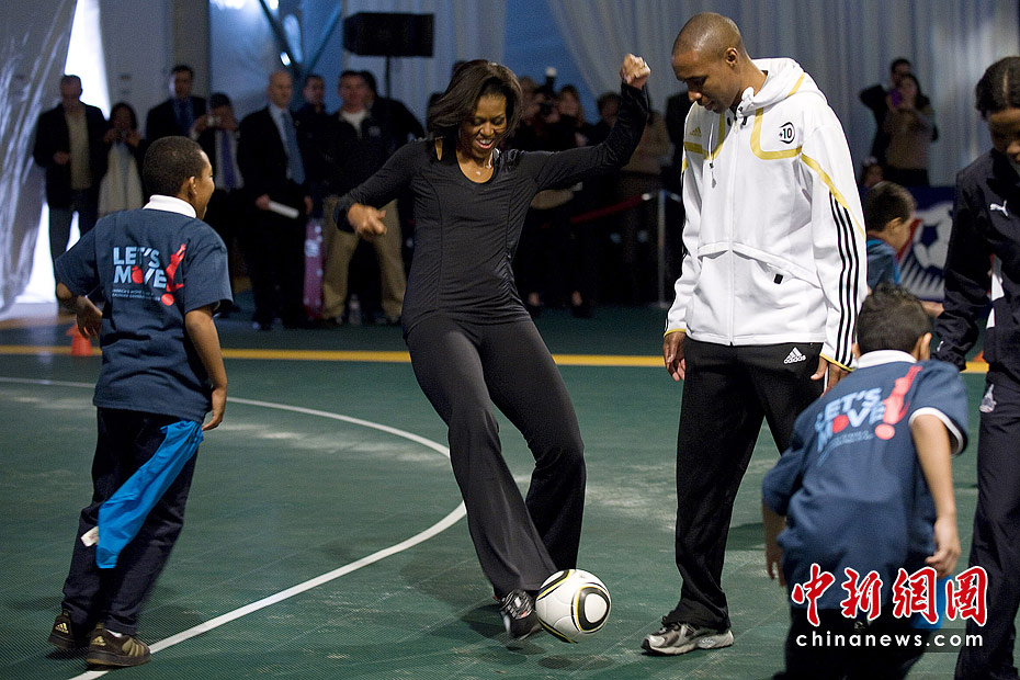 图为2010年3月5日,美国第一夫人米歇尔·奥巴马在华盛顿参加了由美国足球基金会组织的一项慈善活动,米歇尔在活动现场与小朋友们一起享受快乐足球。该活动旨在抵制儿童肥胖,鼓励孩子们选择更加健康积极的生活方式。